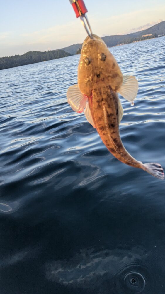 カヤックから風上に向かって軽くキャストし、底取って巻きます。